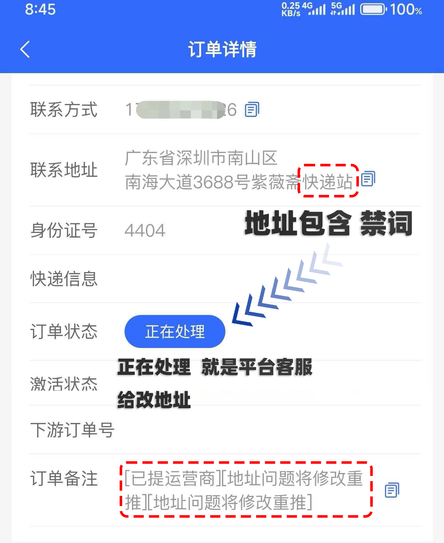 相信有很多小伙伴会遇到一个问题,订单显示审核未通过但是没有显示具体原因,很简单可以使用排除法,下单无非就是身份证、收货号码、地址中审核没通过,大部分 80% 都是地址问题写了公共场所,地址写什么路几号即可,如果审核还是没过可以更换收货号码,还是没过就说明是身份证问题了,需要更换身份证或者换其他产品