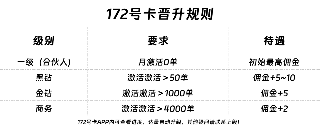 各合作伙伴可扫码注册 172 号卡平台一级,享受最高酬金,最低月激活 50 单晋升黑钻(酬金 +5~10)。